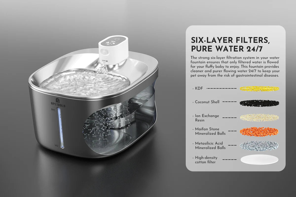 The Triple Action Carbon filter effectively removes, hair, dirt, and other impurities from your cat's water. These can accumulate in your pet's lower urinary tract and potentially cause urinary tract infections.